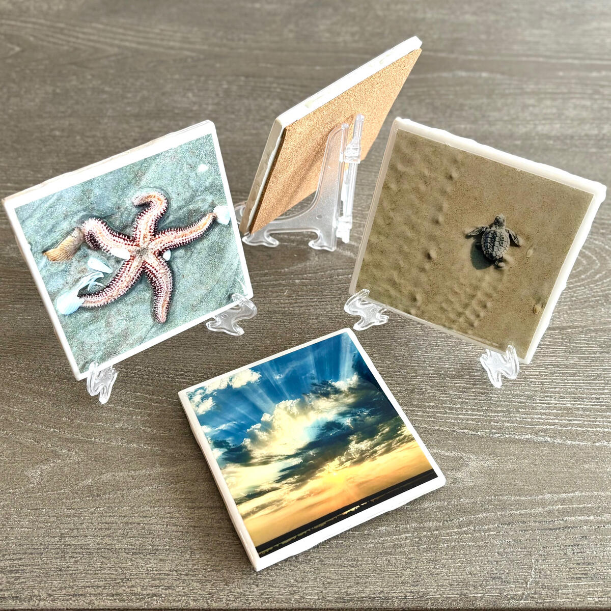 Each coaster includes a small display stand and is handcrafted from original photography.Each coaster is 4" x 4" in size.